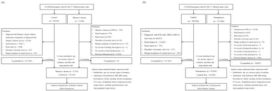 (a) A schematic illustration of the participant selection process that was used in the present study. Of a total of 514,866 participants, 9529 Meniere’s disease participants were matched with 38,116 control participants for age, sex, income, and region of residence. (b) A schematic illustration of the participant selection process that was used in the present study. Of a total of 514,866 participants, 65,858 osteoporosis participants were matched with 65,858 control participants for age, sex, income, and region of residence.
