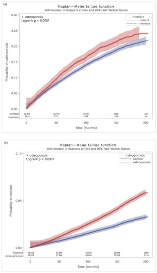 (a) Kaplan–Meier curve for the cumulative incidence rates of osteoporosis in Meniere’s disease participants and control I group (b) Kaplan–Meier curve for the cumulative incidence rates of Meniere’s disease in osteoporosis participants and control II group.