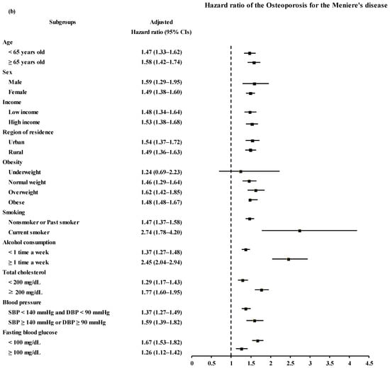 (a) Adjusted hazard ratios of osteoporosis in Meniere’s disease patients according to age, sex, income, region, smoking status, alcohol consumption, obesity, blood pressure, fasting blood glucose, and total cholesterol (b) Adjusted hazard ratios of Meniere’s disease in osteoporosis patients according to age, sex, income, region, smoking status, alcohol consumption, obesity, blood pressure, fasting blood glucose, and total cholesterol.