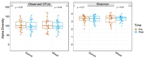 Boxplots showing alpha diversity differences for observed operational taxonomic units (OTUs) and Shannon Index pre- and post-quinoa and control wheat bread arms of the study. Data are presented as means and interquartile range (n = 28).