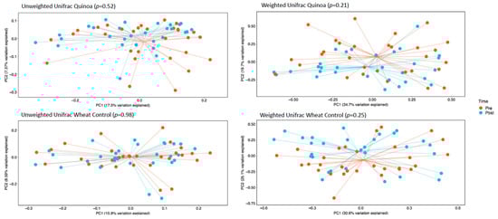 α-Diversity was assessed by comparing the number of observational taxonomic units (OTU) before and after the two 4-week treatment periods. There were no significant changes in α-diversity between baseline and week 4 in either the control or quinoa bread (p > 0.05; Figure 1). In addition, there were no significant changes in weighted or unweighted UniFrac analysis between baseline and week 4 for the quinoa enriched bread (p = 0.52 and p = 0.21, respectively) or the control bread (p = 0.98 and p = 0.25, respectively) (Figure 2).