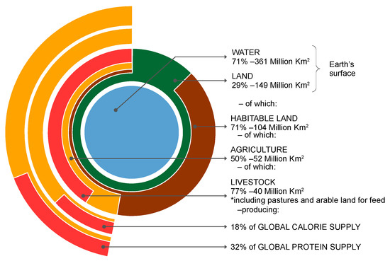 Considered as a share of environmental impact of all anthropogenic activities, agriculture uses 50% of the total living area, of which animal farming uses 77%, providing only 18% of the global calorie intake and 37% of the global protein intake. The graphic representation of this data is delivered in the Figure 4 [50].