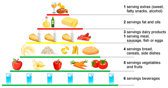 Recommended food intake (food pyramid)—authors’ adaption after [52].