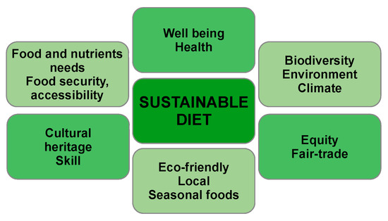 Although sustainable diets and healthy diets share certain characteristics, the concept of a sustainable diet is much broader than that of a healthy diet and incorporates the latter. A healthy diet is characterized by the importance of macro and micronutrients and the nutritional value of the food consumed, resulting in increased well-being of the consumer, while a sustainable diet considers the impact of human dietary habits, healthy or unhealthy, on the environment, not only on human health [17,54].