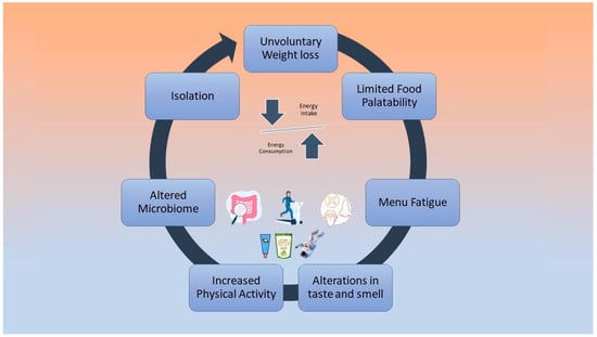 Low energy intake is negatively associated with cardiovascular deconditioning, according to bed rest studies that have investigated the effect of hypocaloric diets on astronauts’ physiology [46,47]. During future long-term missions, negative energy balance will possibly be a cause of greater implications [48]. Factors that may cause reduced dietary intake include altered taste and smell due to the redistribution of body fluids, limited food variety and palatability, isolation, menu fatigue, altered microbiome, and increased physical activity levels [48,49,50]. These factors are depicted in Figure 1.