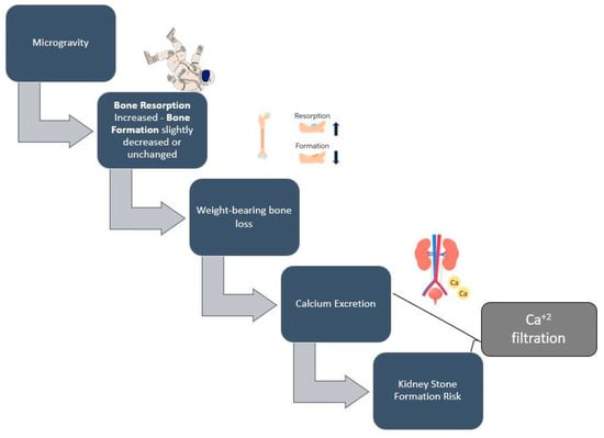 Moreover, the effects of the space environment on bone health has also been of scientific concern. During exposure to microgravity, bone resorption increases significantly, while bone formation remains unchanged or decreases. This imbalance leads to 1–1.5% bone mass loss per month [25]. This loss rate is similar to the bone loss rate observed in postmenopausal individuals per year [12]. Spaceflight-induced bone loss varies between skeletal sites. For example, bone tissue is better preserved in the non-weight-bearing upper limbs, compared to the weight-bearing lower limbs [26]. The increased level of bone resorption is associated with increased levels of calcium and other minerals in the blood circulation and the increased excretion of it in the urine, a process that enhances the astronauts’ risk of developing kidney stones during and after the spaceflight [27,28]. According to Gabel et al. [26], in a sample of seventeen astronauts (14 men and 3 women), spaceflight-induced bone loss was related to the duration of the flight; preflight bone turnover markers, which can be used to identify astronauts at risk; and pre-flight physical activity levels. Further research is needed to investigate whether this loss is recuperated upon their return to Earth. Gabel et al. [29] observed an incomplete bone loss reversal in astronauts’ tibia 1 year from the end of their spaceflight. It is believed that flight duration is proportional to the reverse of bone loss. The longer the space flight, the greater the loss and the more difficult the recovery.