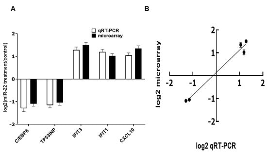 To evaluate effects of miR-22 on gene expression in human intestinal epithelial cells, HIECs were transfected with miR-22 mimics. 24 h later, total RNA was isolated for verification using qRT-PCR as described in Materials and Methods and then for microarray assays. mRNA levels of the whole genome were markedly modified in miR-22 transfected HIECs (Supplementary Figure S1). A total of 608 genes were significantly regulated: 418 genes were down-regulated and 190 genes were up-regulated. The microarray result was subsequently verified by qRT-PCR of five randomly chosen regulated genes: C/EBPδ, TP53INP, IFIT3, IFIT1, and CXCL10. The qRT-PCR results and microarray results were consistent (Figure 2). Functional categorization of miR-22 effects was then conducted in gene ontology (GO) terms (Table 2 and Table 3). The effects of miR-22 are shown in Table 2 and Table 3; the major effects of miR-22 on HIECs are promotion of cell cycle progression, cell growth and proliferation, protection against viral infection, regulation of immune functions, and inhibition of apoptosis.