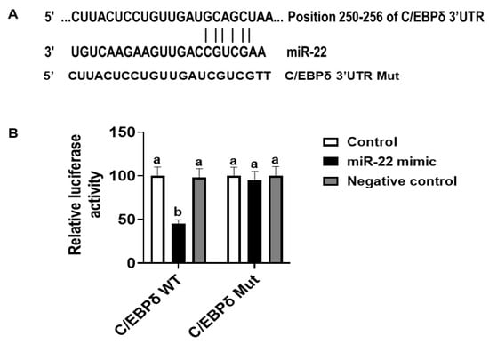 Luciferase assay. (A) There is a putative miR-22 binding site at the 3′-UTR of the C/EBPδ gene (TargetScan, accessed on 1 September 2021). (B) Constructed luciferase vectors and miR-22 mimics or a negative control were co-transfected to HIECs and then luciferase assays were conducted. n = 5. Values are shown as mean ± SD, relative to the control (set to 1). Bars without a common letter are significantly different (p < 0.05).