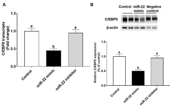 CCAAT/enhancer-binding protein δ (C/EBPδ) is a member of the highly conserved C/EBP family of basic region leucine zipper transcription factors, and it influences a variety of biological processes such as growth arrest, cell death, cell proliferation and, cell differentiation, as well as inflammation [18,19,20,21]. C/EBPδ is a potential target gene of miR-22 since its 3′-UTR contains a predicted miR-22 binding site (http://www.targetscan.org, accessed on 1 September 2021).