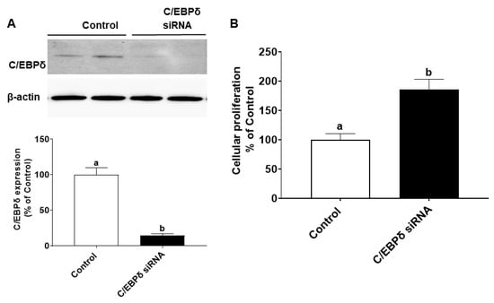 Effects of C/EBPδ inhibition on proliferation of HIECs. HIECs were transfected with C/EBPδ siRNA, and proliferation was then evaluated with a BrdU cellular proliferation kit (Roche). (A) C/EBPδ siRNA significantly inhibited the protein level of C/EBPδ. (B) After C/EBPδ was down-regulated, proliferation of HIEC cells was markedly increased. n = 5. Values are shown as mean ± SD, relative to the control (set to 1). Bars without a common letter are significantly different (p < 0.05).