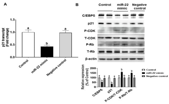 The effects of miR-22 on HIECs consist of direct effects by binding to 3′-untranslated regions (3′-UTR) of mRNA of target genes and indirect effects by regulating gene expression. Prediction of direct target genes of miR-22 in HIECs was conducted using TargetScan (http://www.targetscan.org, accessed on 1 September 2021). We then compared the potential miR-22 target genes and the modified genes identified by microarray. According to the analysis and comparison, the significantly regulated C/EBPδ gene may be one of the important target genes since C/EBPδ is a transcription factor that regulates transcription of genes involved in cell growth arrest [18]. As shown in Figure 4A, there is a potential miR-22 binding site in the 3′-UTR of C/EBPδ mRNA. To determine if C/EBPδ is a direct target of miR-22, luciferase vectors containing the 3′-UTR or mutated 3′-UTR of the C/EBPδ mRNA were constructed and then were co-transfected with miR-22 mimics or a negative control to HIECs. As shown in Figure 4B, miR-22 mimics specifically bound to the 3′-UTR of the C/EBPδ mRNA, while there was no binding to the mutated form. Next, we designed experiments to determine if miR-22 inhibits transcription and expression of the C/EBPδ gene. After HIECs were transfected with miR-22 mimics or a negative control, both the mRNA (Figure 5A) and protein (Figure 5B) levels of C/EBPδ were significantly decreased by miR-22 mimics but not the negative control.