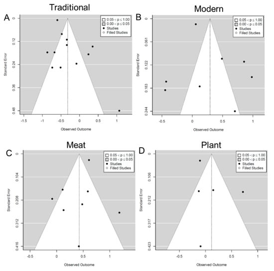 - Egger, M.; Davey Smith, G.; Schneider, M.; Minder, C. Bias in meta-analysis detected by a simple, graphical test. BMJ 1997, 315, 629–634. [Google Scholar] [CrossRef]