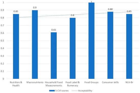 Results from expert review indicated that overall NLit-Br was relevant and acceptable for Brazilians (S-CVI = 0.85). Experts scored all NLit-Br subscales with a score greater than 0.80, except for the subscale Household Food Measurement (S-CVI = 0.61) (Figure 1). Experts expressed that even though the subscale ‘Household Food Measurement’ is relevant in the context of weight management, participants with low education levels would have more difficulty comprehending it. Due to low S-CVI score from experts and in agreement with the author of the original instrument the subscale Household Food Measurement was excluded from the Brazilian version. The adapted NLit-Br had a readability score of 65 or 8th to 9th grade, which is considered acceptable.