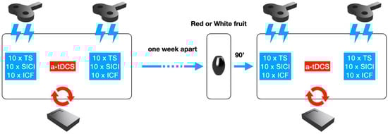 Schematic procedure of the NIBS and NIN sessions. TMS stimulation in baseline conditions was performed before and after a-tDCS to record values of Test stimulus (TS), Short Intracortical Inhibition (SICI), and Intracortical Facilitation (ICF) in random order. Next, one week apart, TMS and a-tDCS stimulations were performed 90 min after red or green fruits ingestion.