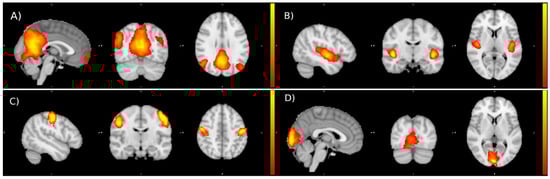 Examples of resting state networks identified by ICA: default mode network (A), auditory network (B), sensory-motor network (C), and visual network (D).