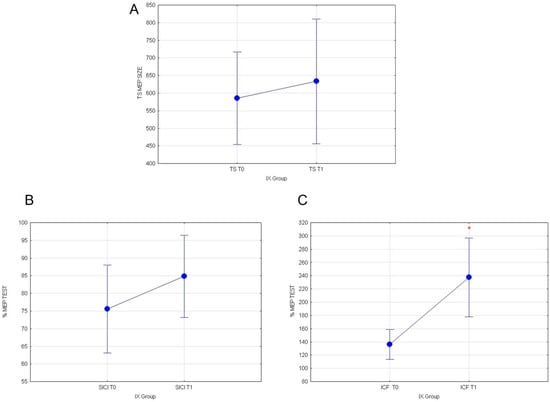 (A) MEP values for TEST stimulus, (B) normalized % MEP for SICI, and (C) normalized % MEP for ICF, at T0 vs. T1 for IX group are shown. Vertical bars denote 0.95 confidence intervals. (*) for p < 0.05.