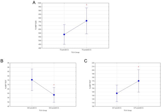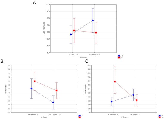 (A) MEP values for TEST stimulus, (B) normalized % MEP for SICI, and (C) normalized % MEP for ICF, at T0 vs. T1 for the IX group, are shown in pre vs. post-TDCS. Vertical bars denote 0.95 confidence intervals. (*) for p < 0.05.