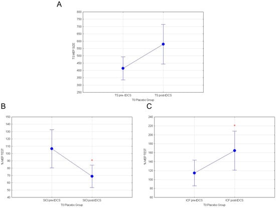 (A) MEP values for TEST stimulus, (B) normalized % MEP for SICI, and (C) normalized % MEP for ICF at T0 for placebo group are shown in pre vs. post-TDCS. Vertical bars denote 0.95 confidence intervals. (*) for p < 0.05.