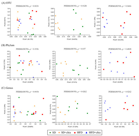 - Mishima, M.D.V.; da Silva, B.P.; Gomes, M.J.C.; Toledo, R.C.L.; Pereira, C.E.R.; Costa, N.M.B.; Martino, H.S.D. Effect of Chia Flour Associated with High Fat Diet on Intestinal Health in Female Ovariectomized Wistar Rats. Eur. J. Nutr. 2022. [Google Scholar] [CrossRef] [PubMed]