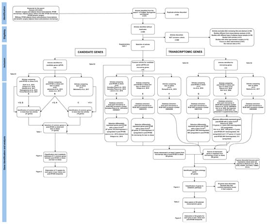 As mentioned above, the main objective of this review is to compare gene expression of SAT before and after RYGB bariatric surgery (different timepoints), as well as with lean samples. Therefore, we selected the publications based on studies comparing post-RYGB vs. obese, as well as lean vs. obese. Then, we divided the publications depending on the methodological approach: (1) candidate genes (qPCR) or (2) transcriptomic genes (microarrays).
