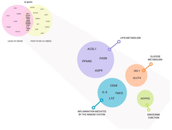 As described above, we analyzed 11 articles where differential gene expression between obese vs. post-RYGB (different timepoints) was reported. We found 21 candidate genes that were common in at least two papers. We classified them upon their function in different metabolic pathways: glucose metabolism (IRS-1 and GLUT4), lipogenesis (ACSL1, ACACA, ACLY, AQP9, ELOVL6, FASN, SCD1, and SREBF1), lipolysis (PLIN1), adipogenesis (PPARG), endocrine function (ADIPOQ and LEP), and inflammation (CASP3, CD68, IL-6, TLF8, TNFα, SPP1, and LYZ).