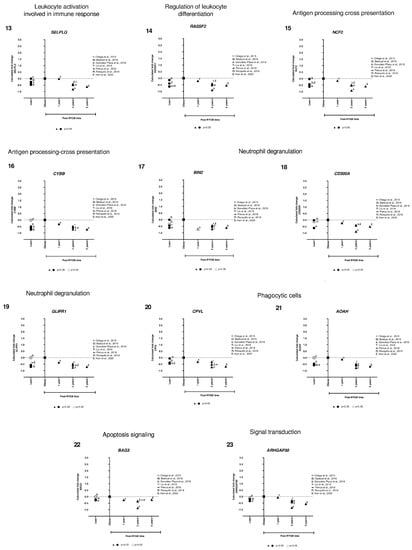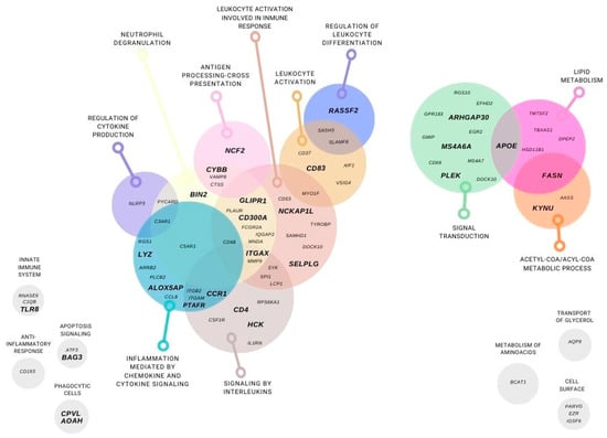 For the 81 genes left, we performed a Gene Ontology analysis (GEO), classifying these genes in different metabolic pathways: lipid and aminoacid metabolism, glycerol transport, acetyl-COA and acyl-COA metabolic process, cell surface, signaling transduction, apoptosis signaling. In addition, most of the genes were classified on inflammation and immune system pathways such as: anti-inflammatory response, innate immune system, inflammation mediated by chemokine and cytokine signaling, interleukins signaling, leukocyte activation and involve in immune response, regulation of leukocyte differentiation, antigen processing cross presentation, neutrophil degranulation, phagocytic cells, and regulation of cytokine production (Figure 4).
