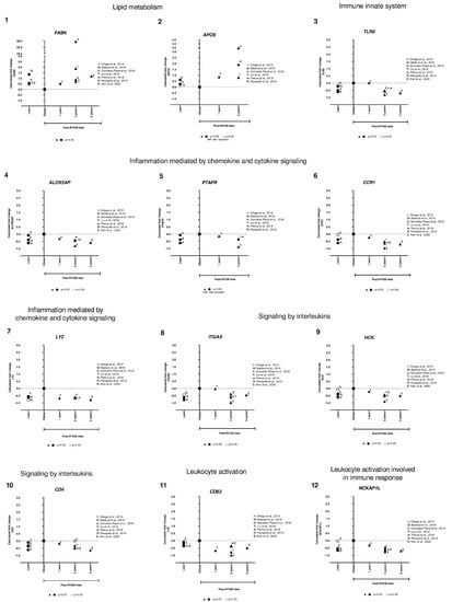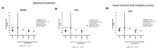 This systematic review and analysis was performed according to the Preferred Reporting Items for Systematic Reviews and Meta-Analyses (PRISMA) guidelines []. Complete data as raw values from the microarrays, reported and calculated gene expression, gene expression fold change, among others, can be found in Supplementary Materials.
