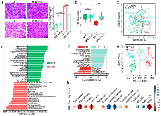 PLE prevents HFD-induced NAFLD associated with the gut microbiota. (a) Representative H&E images of the liver and NAS scores in each group (n = 7~9). (b) Comparison of alpha-diversity indices (PD whole tree index) in each group (n = 7~9). (c) Principal coordinate analysis (PCoA) plots of each group before treatment based on unweighted UniFrac distance matrices (n = 7~9). (d) PCoA plots of each group after treatment based on unweighted UniFrac distance matrices (n = 7~9). (e) Linear discriminant analysis effect size (LEfSe) analysis between the NFD and HFD groups (n = 7~9). (f) LEfSe analysis between the HFD and HFD+PLE groups (n = 7~9). (g) Correlation analysis of the abundances of genera in the gut microbiota with the NAFLD activity score. p values were calculated using the Wilcoxon rank-sum test and corrected by the method described by Benjamini and Hochberg, * p < 0.05, ** p < 0.01 and *** p < 0.01 indicate a significant difference between the two corresponding groups. NFD: treatment with a normal-fat diet; HFD: treatment with a high-fat diet; NFD+PLE: treatment with a normal-fat diet and 150 mg/kg polyphenol-rich Liupao tea extract; HFD+PLE: treatment with a high-fat diet and 150 mg/kg polyphenol-rich Liupao tea extract.