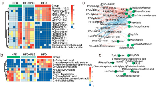 PLE prevents HFD-induced NAFLD associated with metabolites. (a) Heatmap visualizing the changes in the contents of overlapping biomarkers in the serum of the NFD, HFD and HFD+PLE groups (n = 5~7). (b) Heatmap visualizing the changes in the contents of overlapping biomarkers in the feces of the NFD, HFD and HFD+PLE groups (n = 6~7). (c) Spearman correlation analysis between the 14 genera found by Lefse between the HFD and HFD+PLE groups and serum metabolite biomarkers in mice in the NFD, HFD and HFD+PLE groups. (d) Spearman correlation analysis between the 14 genera found by Lefse between the HFD and HFD+PLE groups and fecal metabolite biomarkers in mice in the NFD, HFD and HFD+PLE groups. p values were calculated using the Wilcoxon rank-sum test and corrected by the method described by Benjamini and Hochberg. NFD: treatment with a normal-fat diet; HFD: treatment with a high-fat diet; NFD+PLE: treatment with a normal-fat diet and 150 mg/kg polyphenol-rich Liupao tea extract; HFD+PLE: treatment with a high-fat diet and 150 mg/kg polyphenol-rich Liupao tea extract.