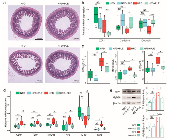 HFD could also affect the epithelial integrity and thus lead to impaired gut permeability and the release of lipopolysaccharide into the circulation. Therefore, we subsequently investigated the effects of PLE on the intestinal barrier and found that PLE improved the ileal morphology in mice receiving a HFD, as evidenced by thickening of the intestinal wall and increased villi (Figure 3a). Similarly, PLE significantly increased the gene expression of Claudin-4 and Occludin, which are essential genes in the tight junctions of the intestine, in the ileum of mice receiving a HFD (Figure 3b). Moreover, PLE restored HFD-induced systemic inflammation by reducing the serum LPS, TNF-α, and IL-6 levels (Figure 3c) but also reversed LPS-induced downstream inflammatory signaling of TLR4 and MyD88 at both the mRNA (Figure 3d) and protein levels (Figure 3e) in the livers of mice receiving an HFD. Together, our results indicate that PLE alleviates intestinal barrier permeability and inhibits LPS-related TLR4-MyD88 signaling in the liver.