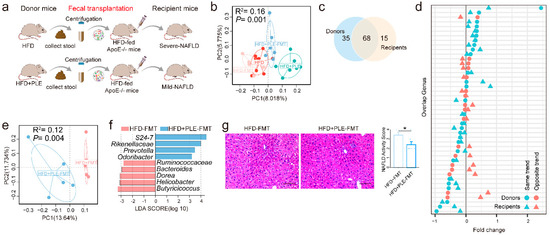In order to further unravel the causal role of the gut microbiota in the beneficial effect of PLE on MAFLD, we subsequently performed a FMT study (FMT, Figure 4a). As expected, a PCoA based on unweighted UniFrac distance matrices showed a significant effect between the intestinal microbiota of donors and recipient mice (Figure 4b). From the donors, 68 of 103 genera successfully colonized the intestine of the recipient mice (Figure 4c). Additionally, 60.29% of the shared genera were found to show the same varying trend across the microbiota of donors and recipient mice (Figure 4d). These data collectively confirmed successful FMT. In addition to finding the different compositions of the gut microbiota in different groups of recipient mice (Figure 4e,f), we observed ameliorated MAFLD (Figure 4g and Supplementary Figure S1b) in the livers of the mice receiving FMT from PLE-treated donor mice, which indicated that the beneficial effects of PLE on HFD-induced MAFLD are causally mediated by the gut microbiota.