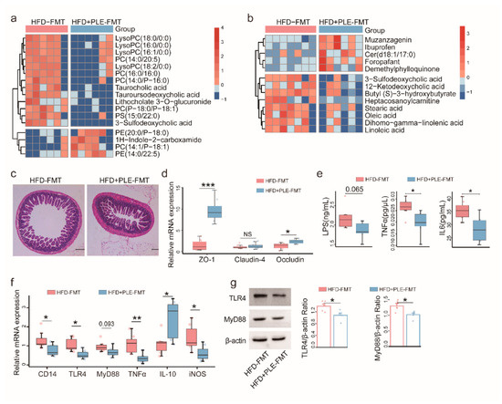 FMT from PLE-treated donor mice alters metabolites, alleviates intestinal barrier permeability and inhibits liver inflammation in recipient mice with HFD-induced MAFLD. (a) Heatmap visualizing the changes in the contents of overlapping biomarkers in the serum of the HFD-FMT and HFD+PLE-FMT groups (n = 6). (b) Heatmap visualizing the changes in the contents of overlapping biomarkers in the feces of the HFD-FMT and HFD+PLE-FMT groups (n = 7). (c) Representative H&E images of the terminal ileum of the HFD-FMT and HFD+PLE-FMT groups (n = 7). (d) mRNA expression of zonula occludens-1, claudin-4 and occludin in the ileum of the HFD-FMT and HFD+PLE-FMT groups (n = 7). (e) Levels of serum LPS, TNFα and IL-6 in the HFD-FMT and HFD+PLE-FMT groups (n = 7). (f) mRNA levels of the TLR4-MyD88 signaling pathway in the livers of the HFD-FMT and HFD+PLE-FMT groups (n = 7). (g) Protein levels of TLR4 and MyD88 in the livers of the HFD-FMT and HFD+PLE-FMT groups (n = 5). p values were calculated using the Wilcoxon rank-sum test and corrected using the method described by Benjamini and Hochberg, * p < 0.05, ** p < 0.01 and *** p < 0.01 indicate a significant difference between the two groups. HFD-FMT: fecal microbiota transplantation from mice in the HFD group and treatment with a high-fat diet; HFD+PLE-FMT: fecal microbiota transplantation from mice in the HFD+PLE group and treatment with a high-fat diet.
