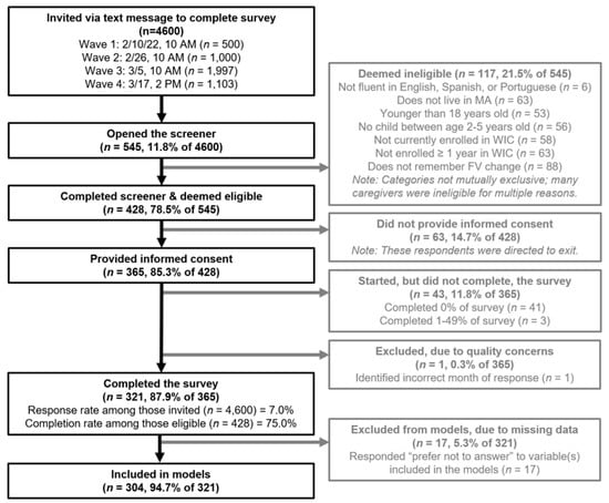 In February-March 2022, the MA WIC State Office invited 4600 randomly selected MA WIC caregivers via text message to complete an online survey, which took approximately 10 min to complete. Eligible adults spoke English, Spanish, or Portuguese; had at least one child (age 2–5 years) enrolled in WIC for at least a year; and remembered the CVB increase. Of those selected caregivers who opened an eligibility screener survey (n = 545), 321 were deemed eligible, provided consent, and completed the full survey (Figure 1). The Harvard T.H. Chan School of Public Health Institutional Review Board approved all study procedures.