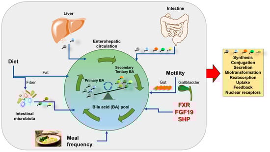 Bile acids (BA) are components of human bile, a brownish or olive-green liquid made of water, organic solutes, and inorganic salt, at a pH of 7.6–8.6. Bile is the major excretion route of cholesterol which appears as solubilized cholesterol and as BA, i.e., degradation products. The three main lipids in bile are bile salts, phospholipids, and nonesterified cholesterol. Free cholesterol accounts for 97% of all sterols in bile, the rest are cholesterol precursors and dietary phytosterols. BA are amphipathic molecules synthesized as “primary” BA from cholesterol in the pericentral hepatocytes. Following their synthesis, primary BA are conjugated with the compound taurine (2-aminoethanesulfonic acid) and the amino acid glycine; this step increases BA solubility in aqueous solutions, such as bile. Primary-conjugated BA are actively secreted from the hepatocyte into bile and are mainly and actively absorbed in the terminal ileum. A small amount will travel to the colon and will undergo the microbiota-dependent biotransformation into “secondary” and “tertiary” BA, which will be passively absorbed. By this dynamic mechanism, BA undergo continuous enterohepatic circulation with 4–12 cycles/day. The fecal loss is minimal at every cycle (5%) and must be compensated by the de novo synthesis of primary BA in the liver (~200–600 mg/daily). The synthesis of BA is modulated by negative feedback mechanisms controlled by the farnesoid X receptor (FXR) in the liver and in the intestine [1,2]. This pathway is strictly linked with the enterohepatic circulation of BA [3], with the signaling role of BA [4], and with the composition and abundance of gut microbiota [5].