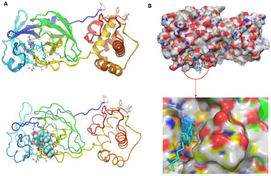 (A) The predicted binding mode of the 25-hydroxy vitamin D at the active site of SARS-CoV-2 major protease (B) Representation of surface image of 25-hydroxy vitamin D binding at the active site of SARS-CoV-2 major protease.