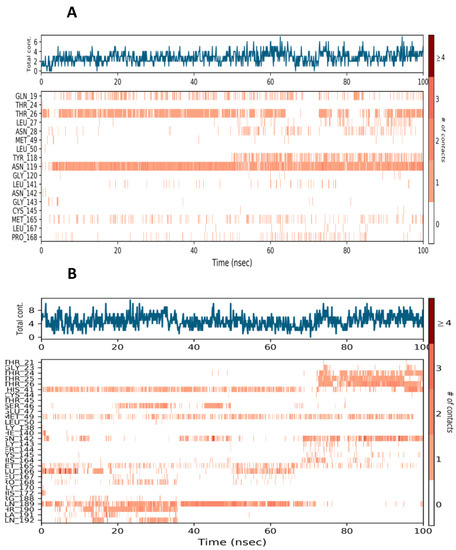 Protein-ligand interaction (A) Mpro-Lopinavir contacts at 30% consistency (B) Mpro-25-hydroxy vitamin D contacts at 30% consistency.