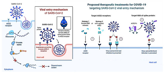 There is a critical need to find new medications with unique mechanisms to limit viral transmission and processing given the severity of the SARS-CoV-2 outbreak and the potential development of comparable coronaviruses from animal reservoirs to create future pandemics. Viral enzymes such as proteases are often regarded as the main targets in the quest for novel anti-coronaviral medications to stop the viral replication cycle. Due to changes that take place in the active region of the enzyme, this technique may, however, result in the selection of inhibitor-resistant strains [78], which may lead to the preponderance of drug-resistant variations in the viral population. This suggests that focusing on viral attachment processes may be a much safer method of overcoming anti-coronaviral medication resistance, especially in the absence of efficient vaccinations. To comprehend how proteins work, it is crucial to determine their precise molecular structures. This process is also a key step in many drug development initiatives. Unfortunately, it will be difficult to discover the experimental structures of many proteins since there aren’t any. Computer modeling is one method for resolving this issue. However, the projected structures will have flaws since the existing modeling techniques are not particularly reliable. New methods are therefore required to improve the structural accuracy of protein models. The COVID-19 drug’s mechanism of action is depicted in Figure 7. The graphic shows an overview of virus-cell interaction-based treatment approaches to treat SARS-CoV-2 infection. Strategies that target the host include RBD mimics and antibody fragments such as scFv. Strategies that target viruses include antibodies or antibody fragments like Fc. The ACE2-RBD interaction is suppressed in both situations, avoiding infection.