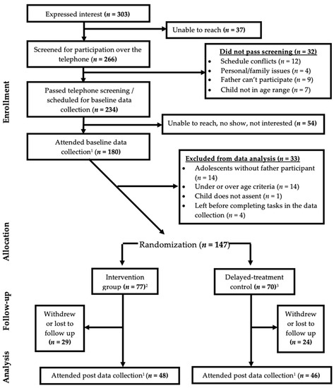 A total of 303 father-adolescent dyads expressed interest in participating in the study (Figure 1). Of those, 266 were screened for eligibility over the telephone and 234 were identified as eligible. Of the 234 dyads, 54 did not attend the Time-1 data collection session, and 20 dyads did not complete the data collection procedures. Time-1 data collection sessions were completed by 147 father/adolescent dyads, with 94 father/adolescent dyads completing both Time-1 and Time-2 data collection.