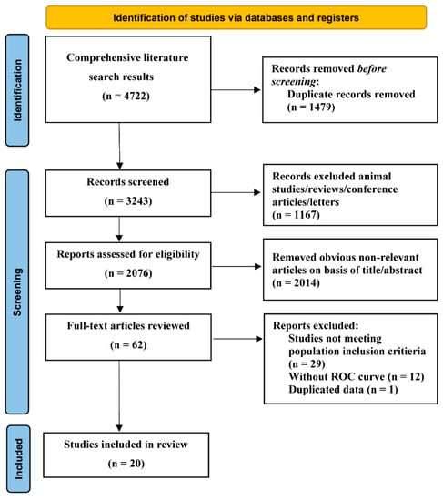 The comprehensive computer literature search from PubMed, MEDLINE, Web of Science, EMBASE and the Cochrane Library revealed 4722 articles, as shown in Figure 1. Ultimately, 20 studies involving 165,725 participants were included [10,21,22,23,24,25,26,27,28,29,30,31,32,33,34,35,36,37,38,39].