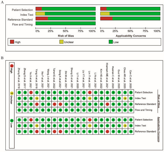 Methodological quality of included studies in accordance to the Quality Assessment of Diagnostic Accuracy Studies-2 (QUADAS-2) tool. (A) Overall assessment of the quality for included studies. (B) Methodological quality summary for included studies [10,21,22,23,24,25,26,27,28,29,30,31,32,33,34,35,36,37,38,39].