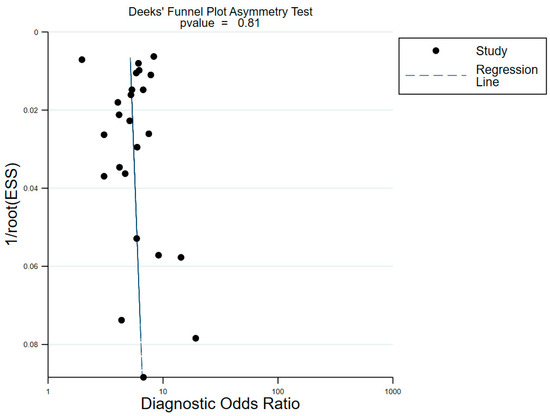 The risk of bias within the included studies was assessed via QUDAS-2 (Figure 2). According to QUDAS-2, all studies fulfilled more than 11 items from the 14-item QUDAS-2 checklist, which indicated overall high quality. Meanwhile, no significant publication bias was found (p = 0.81 for the slope coefficient), as shown in Figure 3.