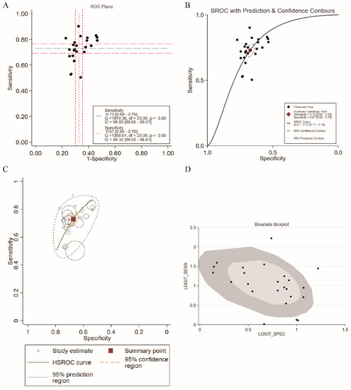 - Reitsma, J.B.; Glas, A.S.; Rutjes, A.W.; Scholten, R.J.; Bossuyt, P.M.; Zwinderman, A.H. Bivariate analysis of sensitivity and specificity produces informative summary measures in diagnostic reviews. J. Clin. Epidemiol. 2005, 58, 982–990. [Google Scholar] [CrossRef]