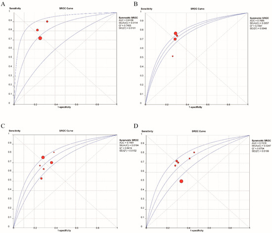The presence of threshold effects could lead to differences in sensitivity and specificity. The cut-off values of this meta-analysis ranged from 0.146 to 8.7 (the data in four studies were missing). To assess the diagnostic performance of the TyG index at different cut-off values, subgroup analyses were conducted (cut-off values of TyG: <6 (n = 3), 6–8 (n = 4), 8–8.5 (n = 6), and ≥8.5 (n = 6)). The detailed results are shown in Table 4. For the TyG cut-off < 6 group, the pooled sensitivity and specificity with 95% CI were 0.75 (0.71, 0.78) and 0.74 (0.72, 0.76), respectively. The AUC was 0.81 ± 0.01, and a high diagnostic value was found. Meanwhile, we found that with the increase in the TyG cut-off value, the diagnostic value of TyG for MAFLD decreased. Therefore, the determination of the optimal cut-off value needs to be combined with more data and specific clinical situations (Figure 5, Table 4).