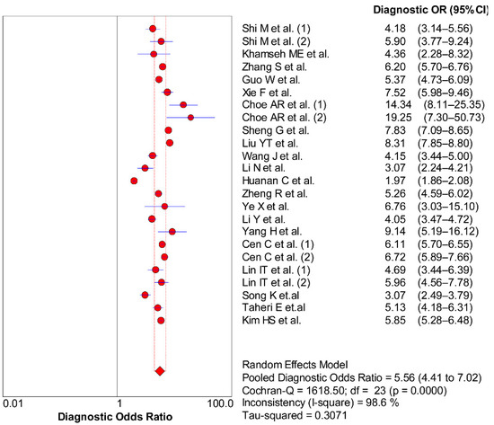Forest plot of DOR with corresponding 95% CI of TyG for MAFLD [10,21,22,23,24,25,26,27,28,29,30,31,32,33,34,35,36,37,38,39].