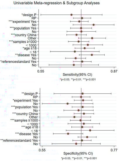 As shown in Figure 6 (DOR = 5.56, 95% CI = 4.41, 7.02, Q = 1618.50, p < 0.001), part of the heterogeneity could also be due to non-threshold effects. We further found the source of heterogeneity through sensitivity analysis, subgroup analysis and meta-regression. The results indicated that including the country, number of samples, age and disease situation were the sources of sensitivity and specificity heterogeneity (p < 0.05) (Figure 7).