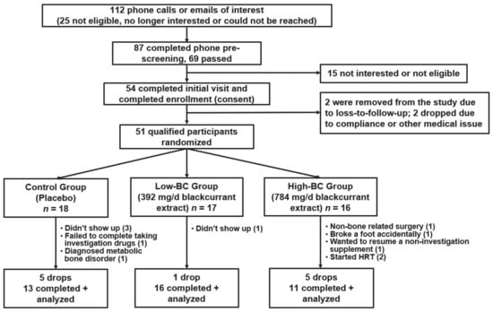 Nosal, B.M.; Sakaki, J.R.; Macdonald, Z.; Mahoney, K.; Kim, K.; Madore, M.; Thornton, S.; Tran, T.D.B.; Weinstock, G.; Lee, E.C.-H.; et al. Blackcurrants Reduce the Risk of Postmenopausal Osteoporosis: A Pilot Double-Blind, Randomized, Placebo-Controlled Clinical Trial. Nutrients 2022, 14, 4971. https://doi.org/10.3390/nu14234971