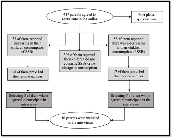 The second phase involved 10 randomly selected parents that reported changes in their child’s SSBs consumption during lockdown. The parents were divided into two groups: the first group comprised participants that reported an increase in consumption and the second group involved participants that reported a decrease. Five participants were randomly selected from each group. The interviews were conducted with the aid of a smart phone, and followed a structured topic guide (Appendix B). Figure 1 shows the flow-chart of participants at different research phases. The interview incorporated open-ended questions about the child’s SSBs consumption and explored factors that may have influenced changes in their eating behavior, such as parental awareness, financial issues, and lifestyle changes. The interviews were audio-recorded and transcribed verbatim. The interviews were conducted in the Arabic language and translated into English.