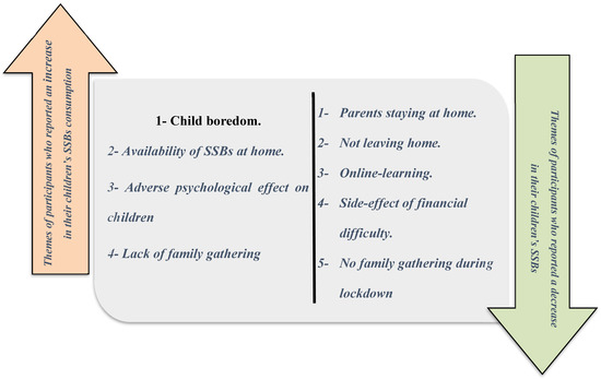 The findings show a complex interaction between the child’s habits and parental, social, and financial factors during COVID-19 lockdown that affected eating and drinking habits. The main themes reported by the parents of children who saw an increase in their child’s SSBs consumption were child boredom and parental compensation for the adversity of COVID-19 lockdown. These themes were consistent with the findings of Philippe et al. (2021), which showed that child boredom and parental motivation for buying foods increased their consumption [30]. Some other themes that emerged in this study were the availability of SSBs at home, no physical activity, and the lack of family gathering. This agrees with the study conducted in 2021, by Alshehri and Al Agha, that investigated the impact of the COVID-19 lockdown on the dietary habits and physical activity of children and adolescents living in Saudi Arabia and reported an increase in the consumption of unhealthy food and drink and a decrease in the physical activities [31].