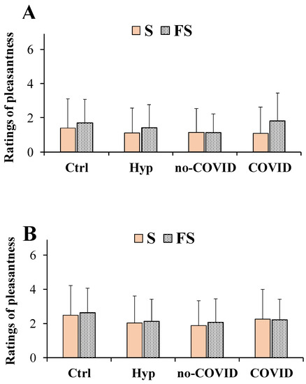 Ratings of pleasantness dimension measured in total patients with hyposmia (Hyp, n = 57), subjects without (no-COVID, n = 34) or with (COVID, n = 23) post-acute coronavirus syndrome compared to healthy controls (Ctrl, n = 91), in response to saline solutions obtained with pure sea salt (S) and flavored salts (FS) at the concentrations of 0.1 g/mL (high dose) (A) and 0.04 g/mL (low dose) (B). Data are presented as mean values and standard deviations. For FS, each value of the taste dimensions was obtained as the mean of participant responses to the three different commercial FS samples. Significant differences among the four different groups of subjects (as between factors) in relation to the type of salt (S and FS as within factor) were calculated using two-way repeated measures ANOVA.