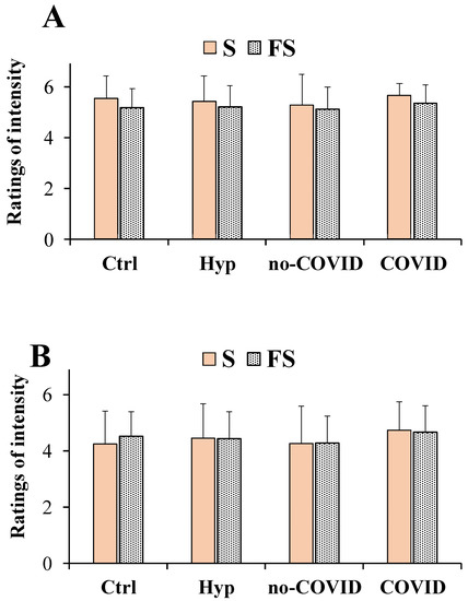 Ratings of intensity dimension in total patients with hyposmia (Hyp, n = 57), subjects without (no-COVID, n = 34) or with (COVID, n = 23) post-acute Coronavirus Syndrome compared to healthy controls (Ctrl, n = 91), in response to the saline solutions obtained with pure salt (S) and flavored salts (FS) at the concentrations of 0.1 g/mL (high dose) (A) and 0.04 g/mL (low dose) (B). Data are presented as mean values and standard deviations. Regarding FS, each value of the taste dimensions was obtained as the mean of participant responses to the three different commercial FS samples. Significant differences among the four different groups of subjects (as between factors) in relation to the type of salt (S and FS as within factor) were calculated using a two-way repeated measures ANOVA.